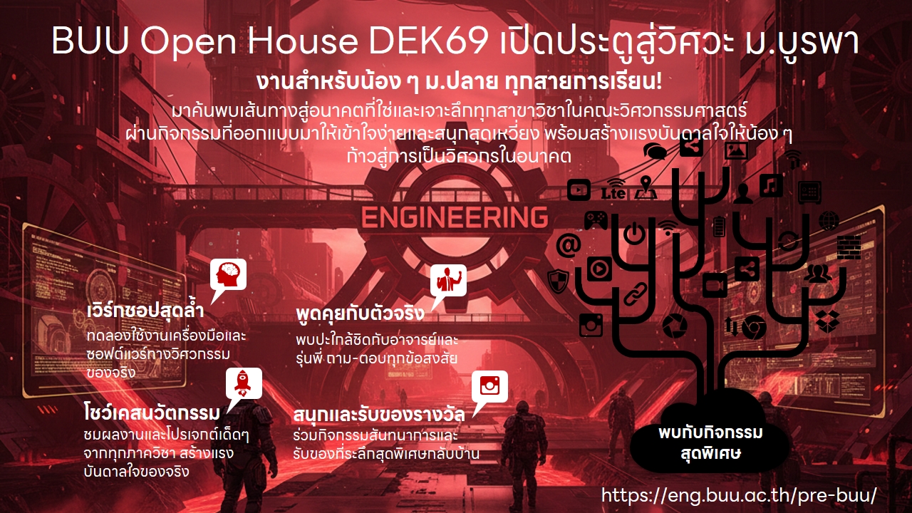 Faculty Spotlights ในกิจกรรม Open House ของมหาวิทยาลัยบูรพา เพื่อให้น้อง ๆ ที่สนใจได้เข้ามาเยี่ยมชมและรู้จักคณะต่าง ๆ อย่างใกล้ชิด ซึ่งงาน BUU Open House DEK69 นั้น มีการจัดบูธแสดงผลงานของทุกคณะ ที่หอประชุมธำรง บัวศรี และยังมีคณะที่เปิดบ้าน (Open House) ในที่ตั้งของคณะ ได้แก่ คณะพยาบาลศาสตร์ (NU) คณะบริหารธุรกิจ (BBS) คณะวิศวกรรมศาสตร์ (ENG) คณะศึกษาศาสตร์ (EDU) คณะโลจิสติกส์ (LOG) คณะวิทยาศาสตร์การกีฬา (FSS) วิทยาลัยนานาชาติ (BUUIC) คณะสหเวชศาสตร์ (AHS)